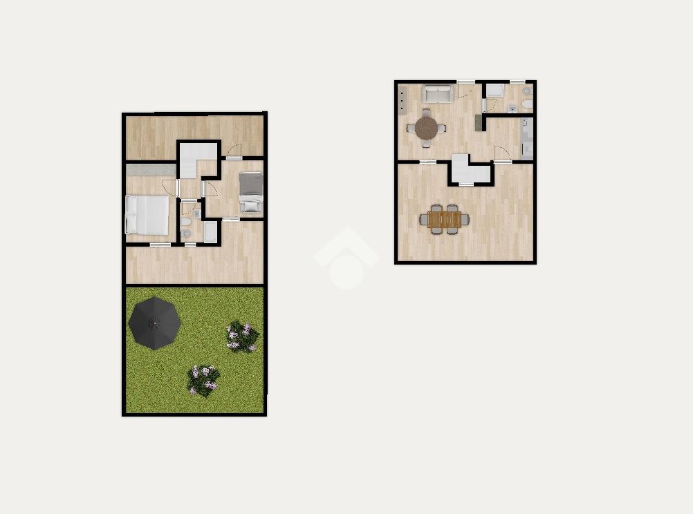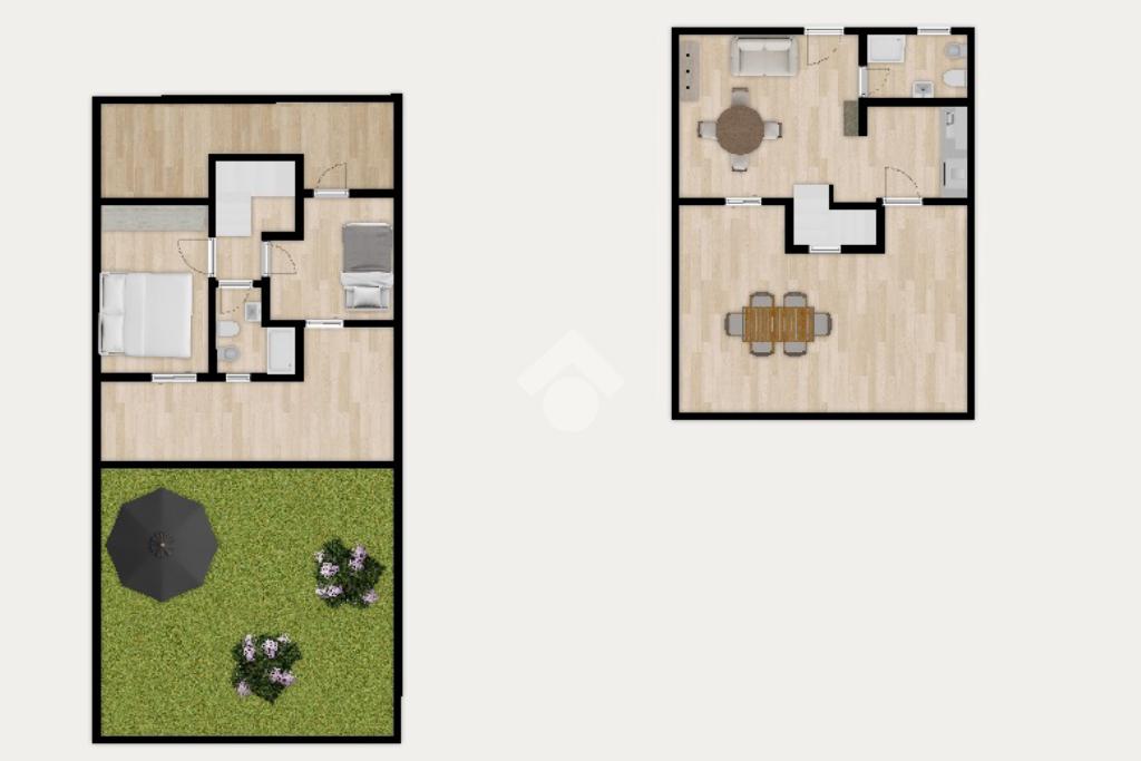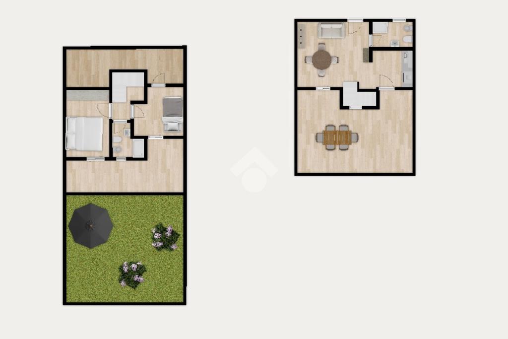 Dal piano terra, tramite una comoda scala interna, accediamo al piano inferiore, dove trovano spazio il secondo bagno e le due camere da letto, entrambe con uscita su un'ulteriore veranda coperta.