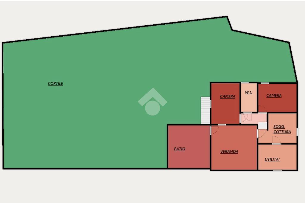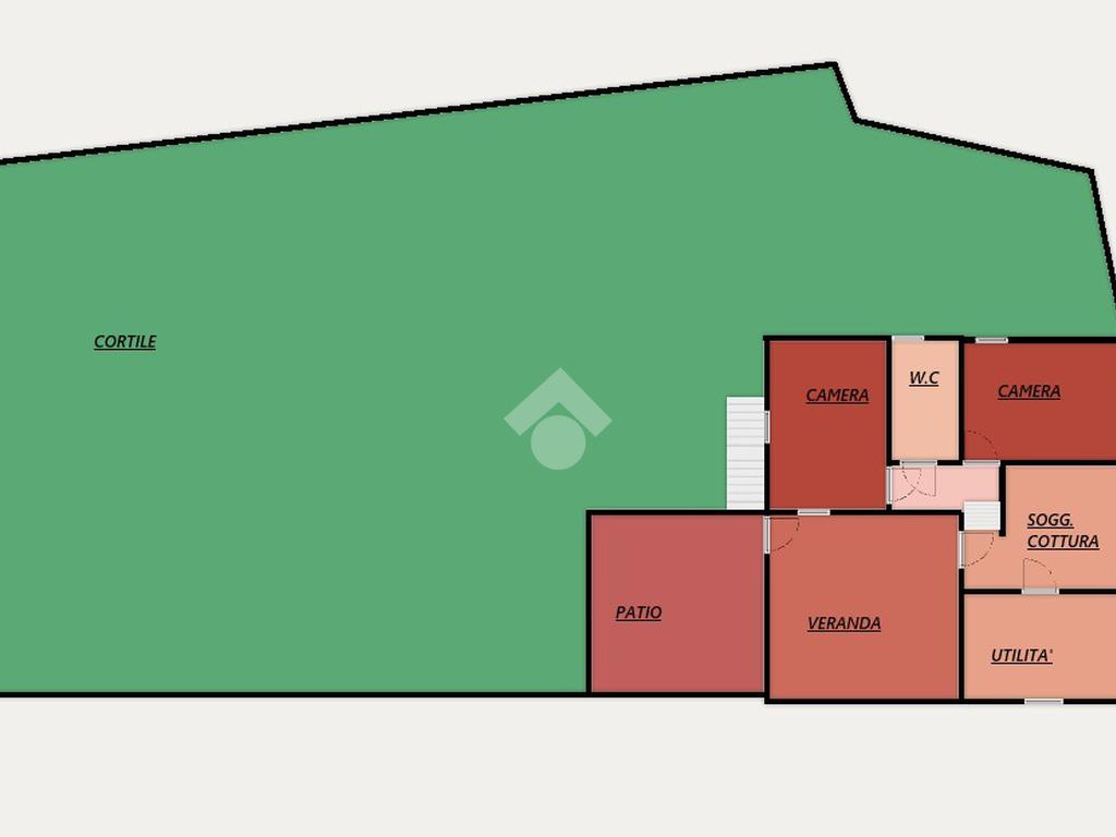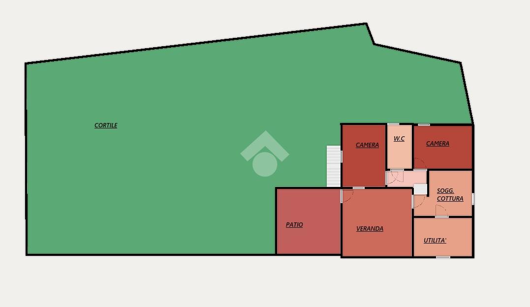 Da questo ambiente, accediamo all'interno dell'abitazione costituito da soggiorno con angolo cottura, due camere matrimoniali e dal bagno finestrato.